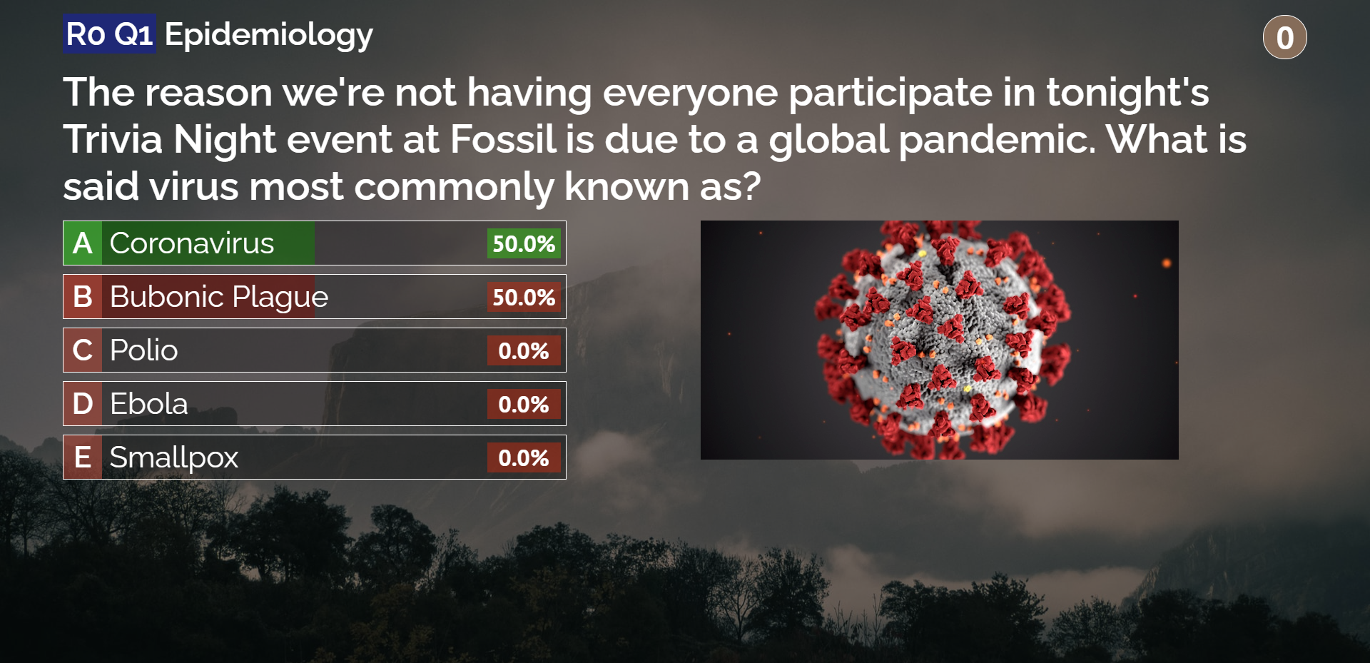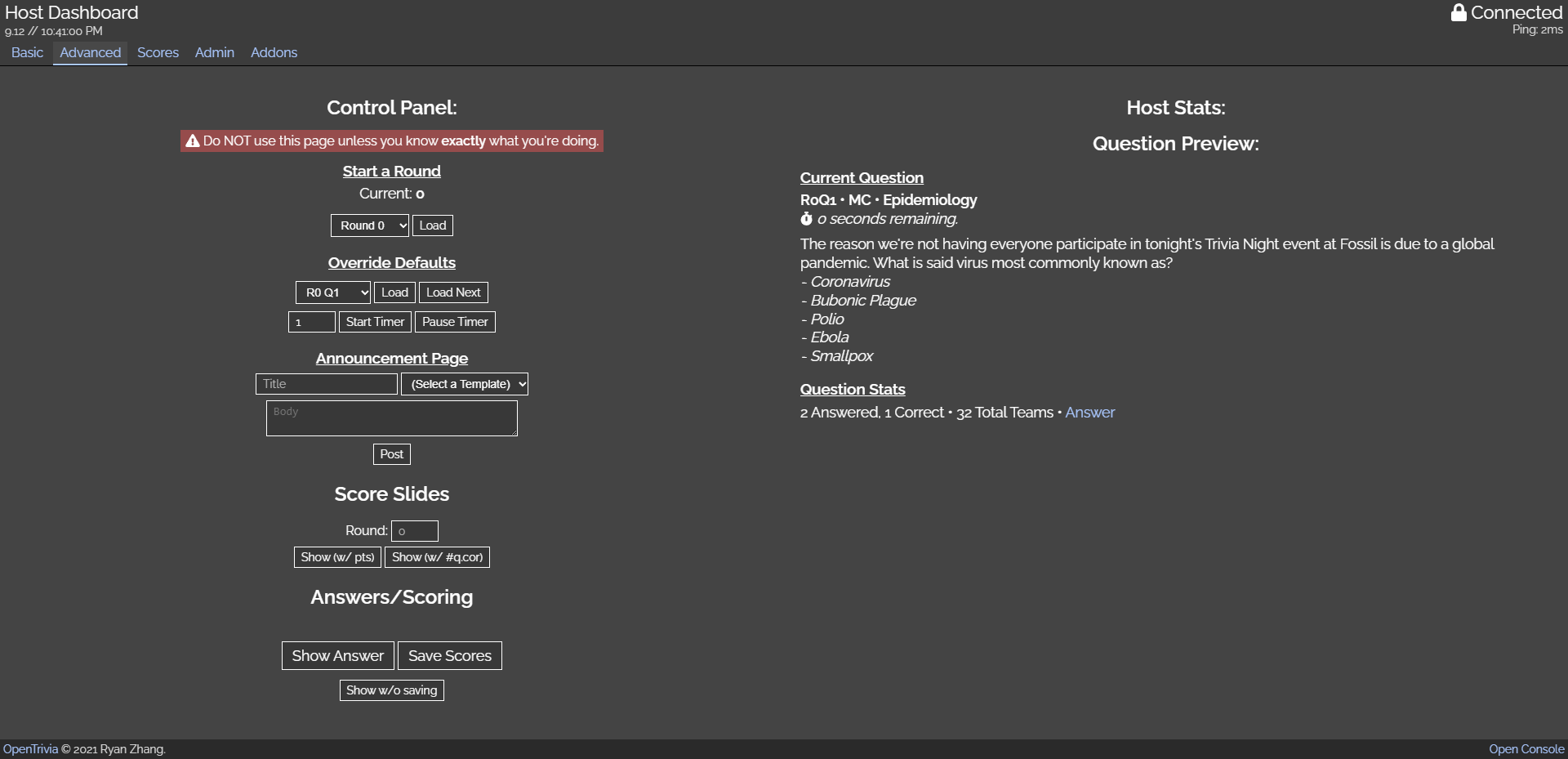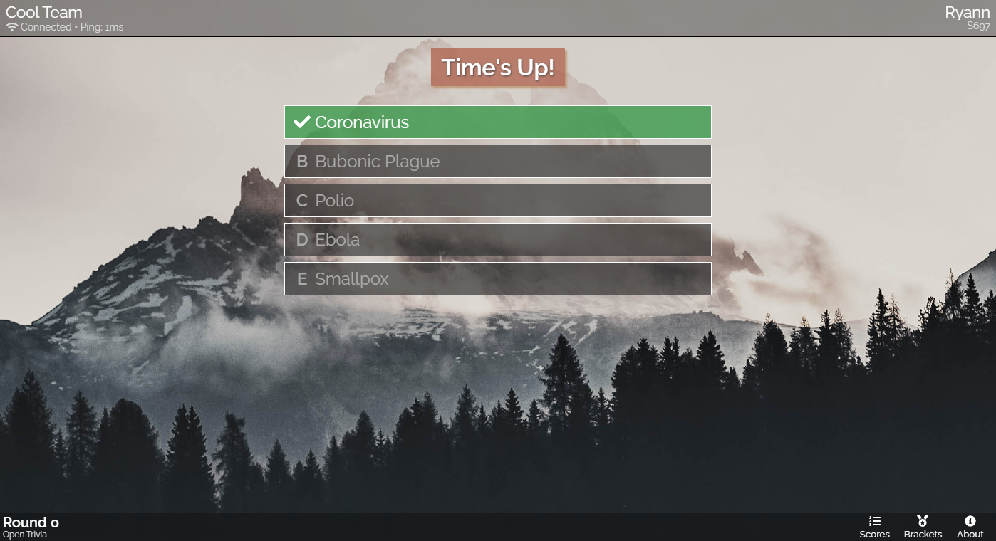 Think of it like Socrative, except less test-like and more flexible. Open Trivia is an all-in-one trivia server that handles a client interface, a host interface, and a slideshow interface (intended to be projected/presented). It supports the following:
